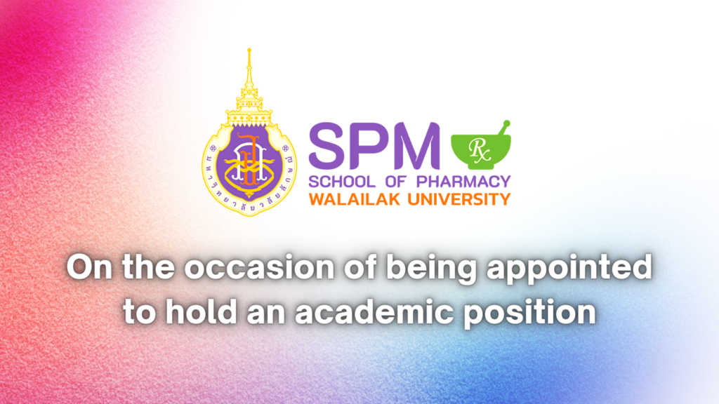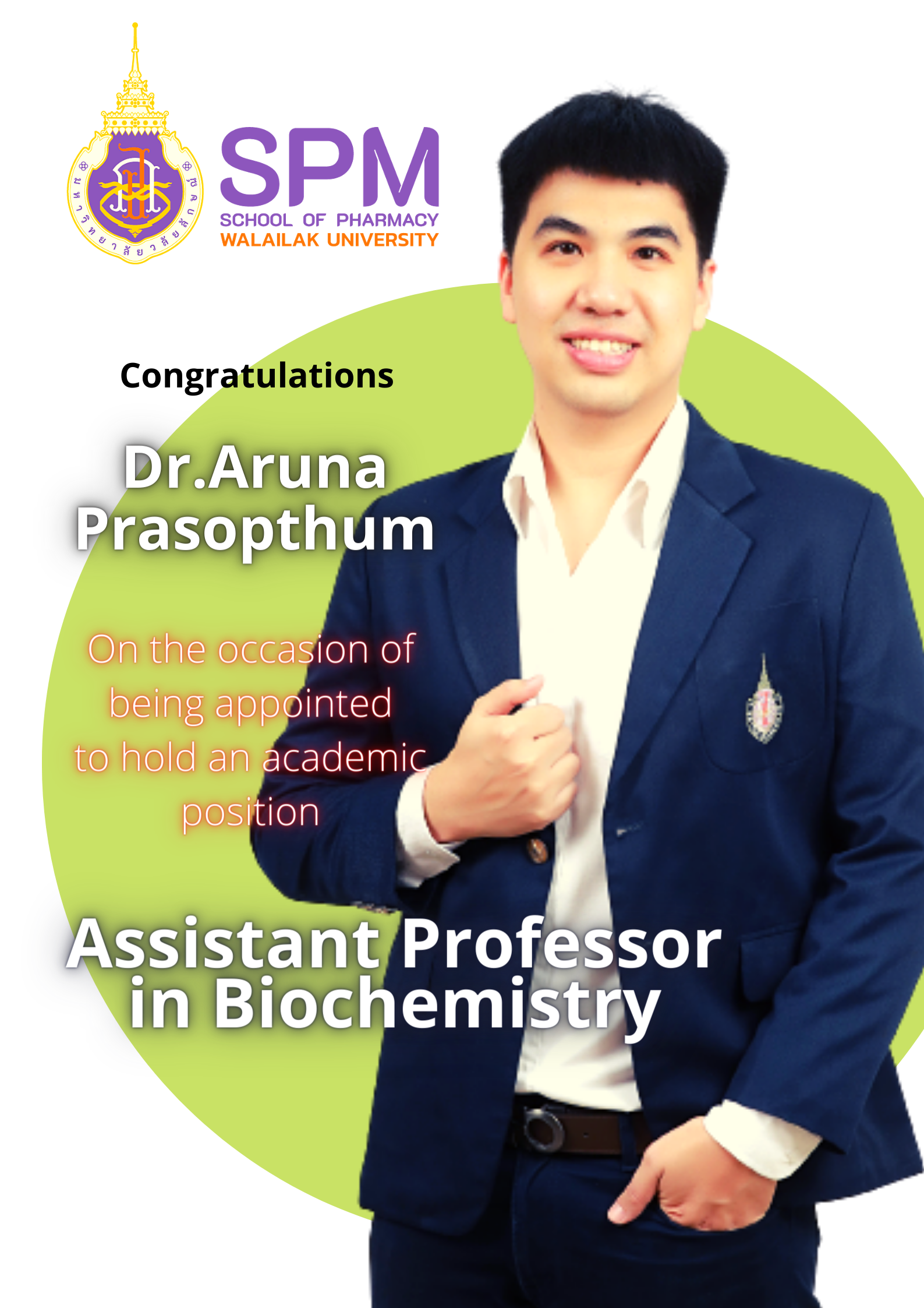 School of Pharmacy, Walailak University would like to congratulate our staff, Dr.Aruna Prasopthum, for being promoted by the University Council of Walailak University on 9 July 2022 as “Assistant Professor” in Medical Sciences (Biochemistry).