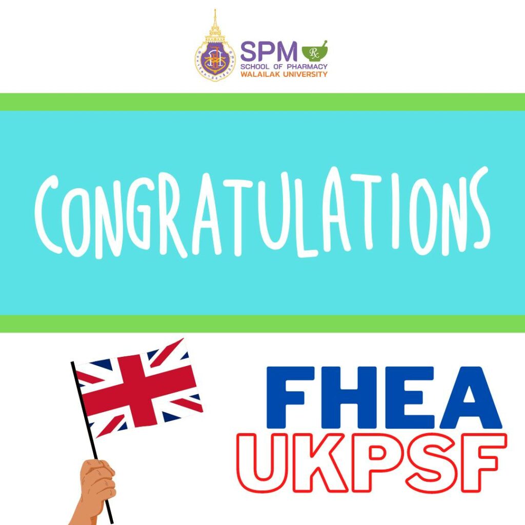 Congratulations to Miss Kanruethai Sangkhno, lecturer (Pharmaceutical Care), School of Pharmacy, Walailak University on the occasion of being certified “Fellow” or FHEA from The Higher Education Academy, UK in UK Professional Standards Framework (UKPSF). Miss Kanruethai Sangkhno is HEA Fellowships number 568 of Walailak University. She attended the Pre-UKPSF special training (Number 331) and is the newest FHEA of the School of Pharmacy, at Walailak University.