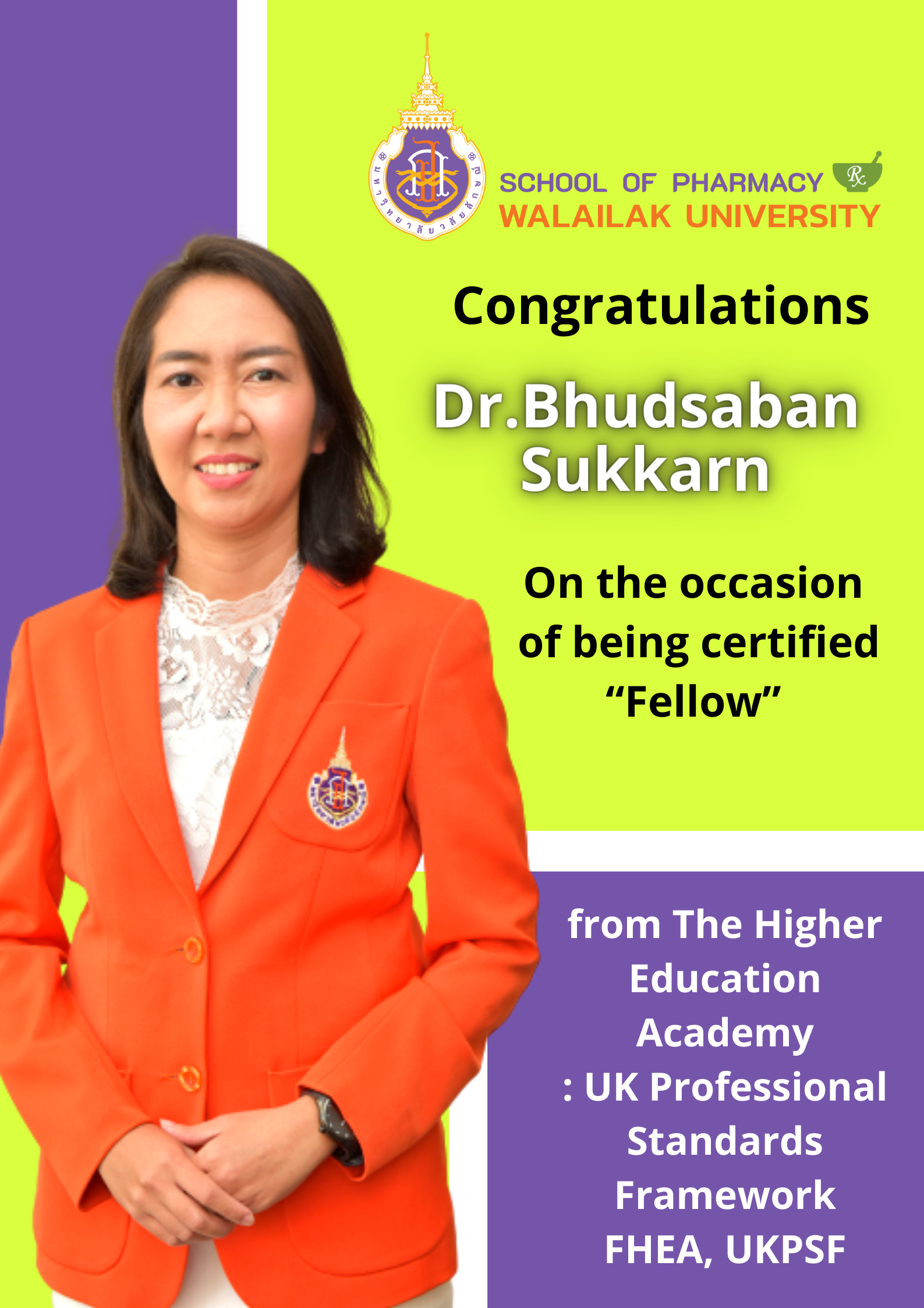 School of Pharmacy, WU would say congratulations to new FHEA or Fellow in UKPSF, Dr.Bhudsaban Sukkarn who is 28th FHEA of us. She attended Pre-UKPSF training provided by WU and a Special project for achieving a Fellow in UKPSF provided by WU.