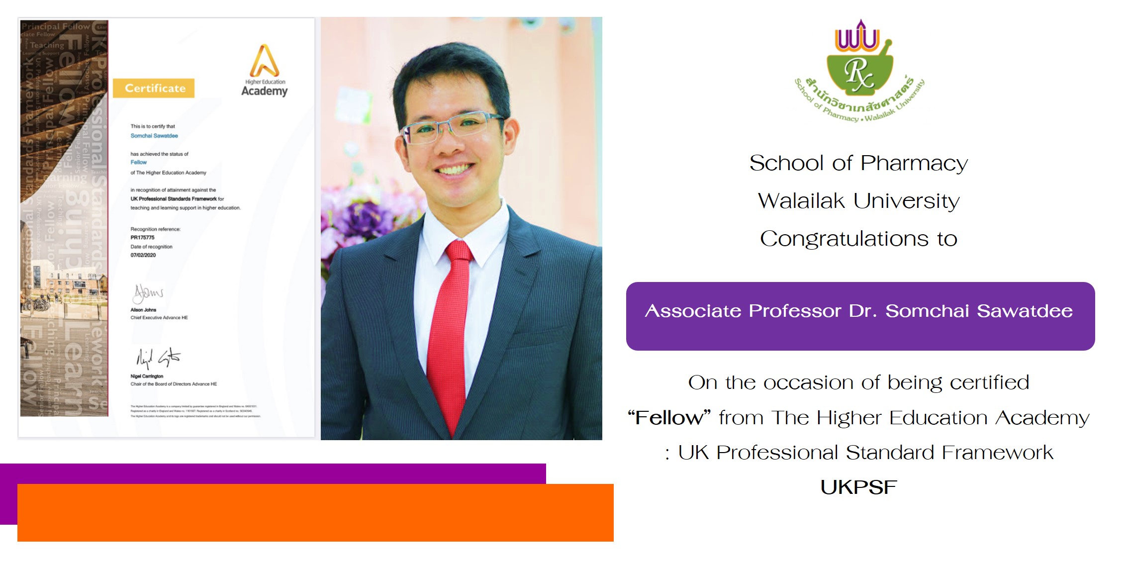 The School of Pharmacy, WU is delighted to congratulate our recent Fellow of the Higher Education Academy (FHEA), Associate Professor Dr. Somchai Sawatdee. He, among the other participants of the 3rd generation UKPSF scheme of WU, was firstly conferred HEA fellowship.