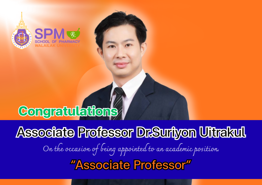 The School of Pharmacy at Walailak University extends its warmest congratulations to Associate Professor Dr. Suriyon Uitrakul on his recent academic promotion. This achievement highlights his dedication to academic excellence and his significant contributions to the field of pharmacy.