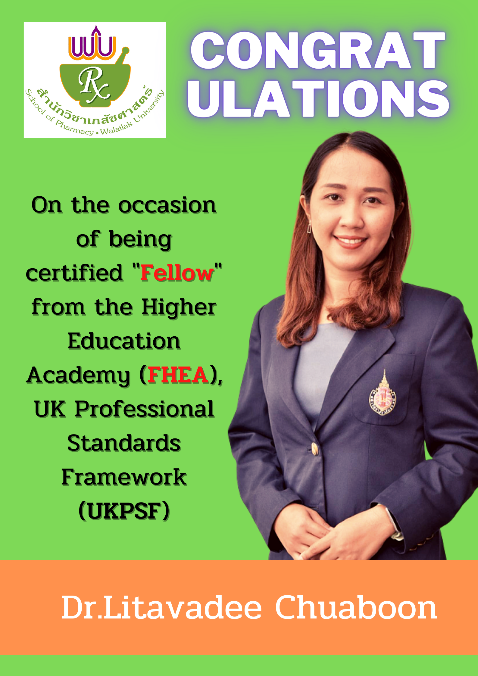 Congratulations to Dr. Litavadee Chuaboon who certified as a Fellow (FHEA) from The Higher Education Academy in the UK Professional Standards Framework (UKPSF). Dr. Litavadee Chuaboon is the 20th FHEA of School of Pharmacy, Walailak University.