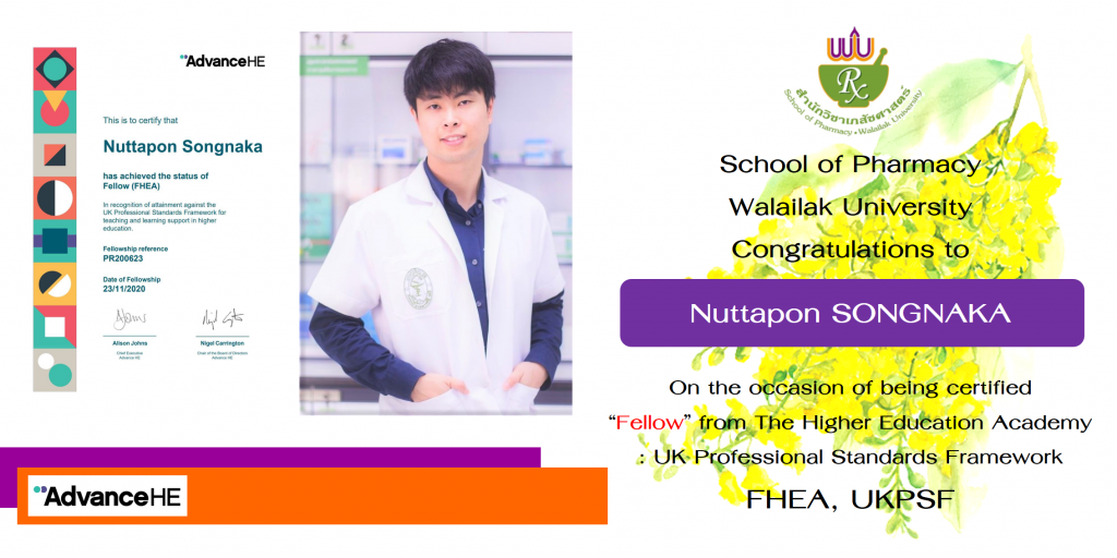 The School of Pharmacy, WU is delighted to congratulate our recent Fellow of the Higher Education Academy (FHEA), Nuttapon SONGNAKA, as a result of being trained in the 4th generation UKPSF scheme of WU.