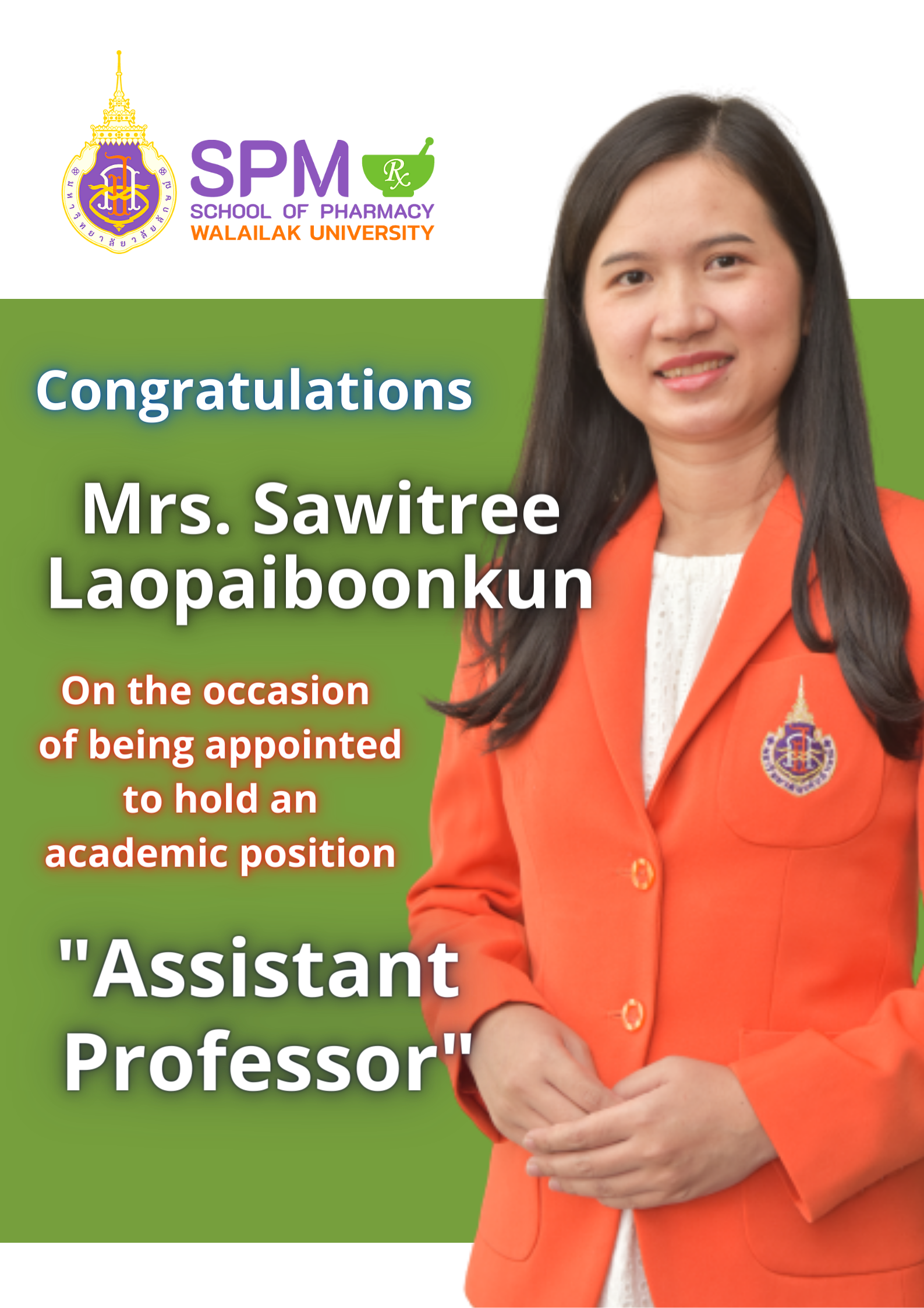 Mrs.Sawitree Laopaiboonkul, MS. in Pharm (Clinical Pharmacy) Prince of Songkhla University being appointed to hold an academic position as “Assistant Professor” (Since 15th February 2022)