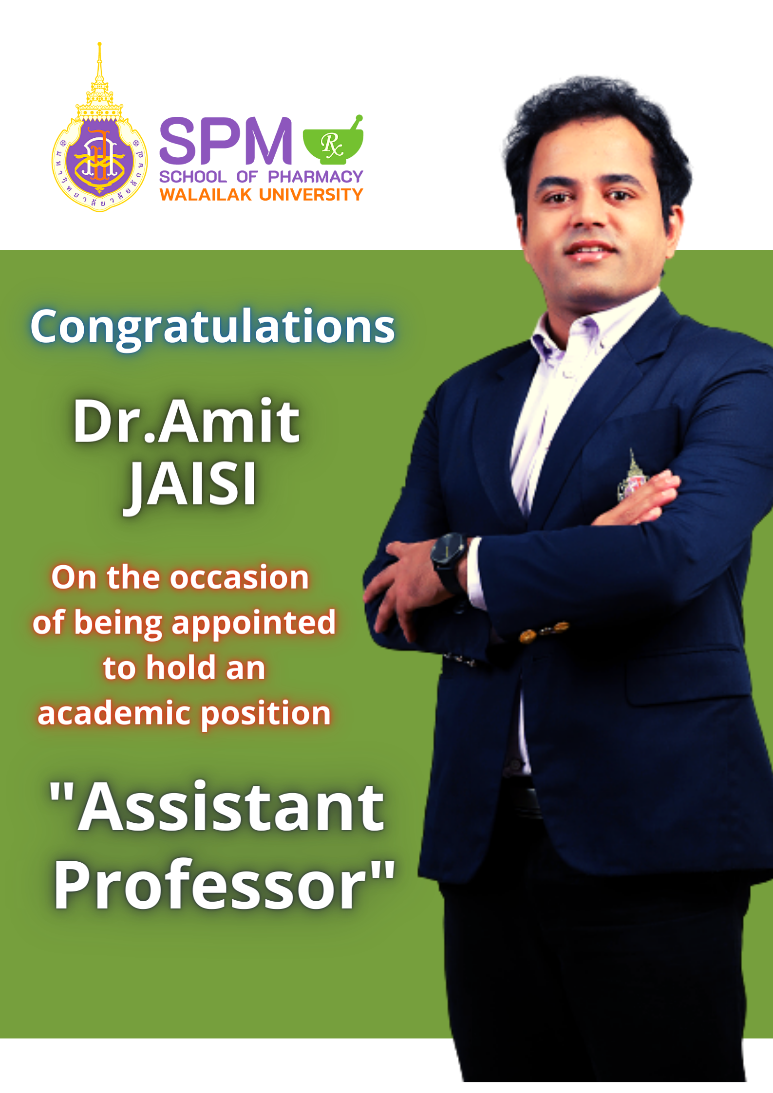 Dr.Amit Jaisi, Ph.D. (Pharmaceutical Science) Prince of Songkhla University being appointed to hold an academic position as “Assistant Professor” (Since 15th October 2021)