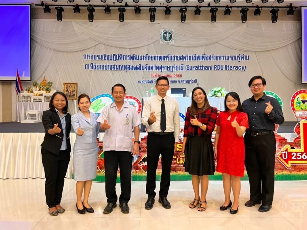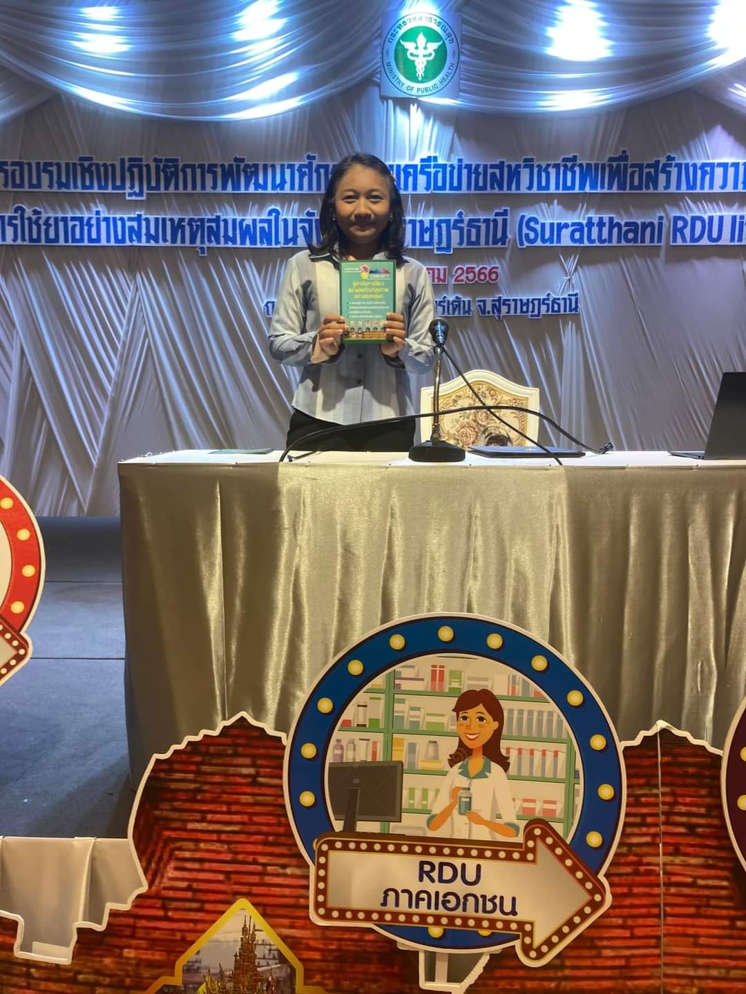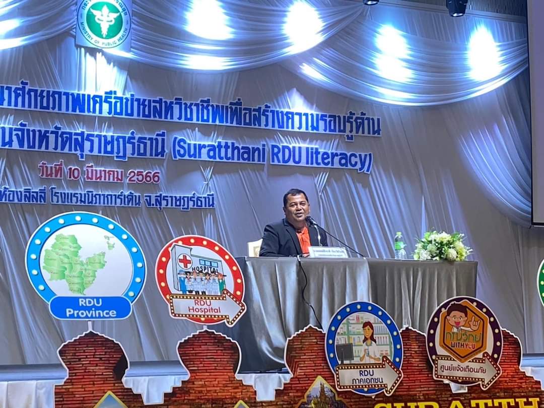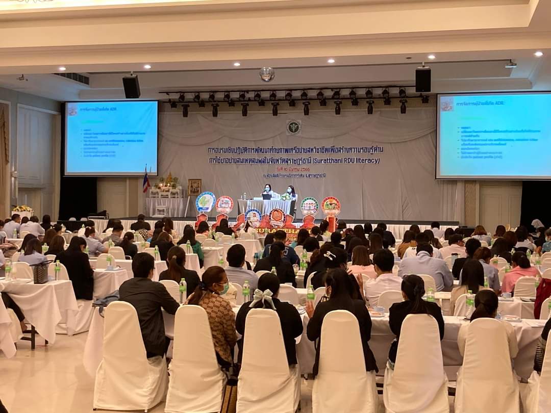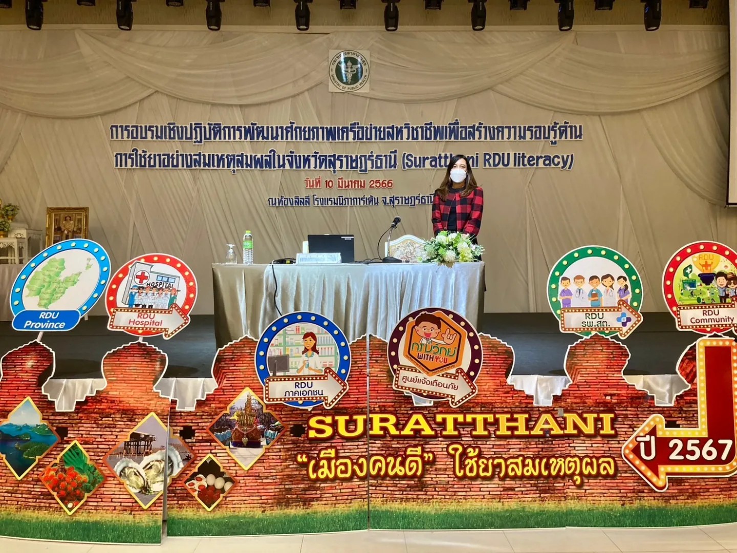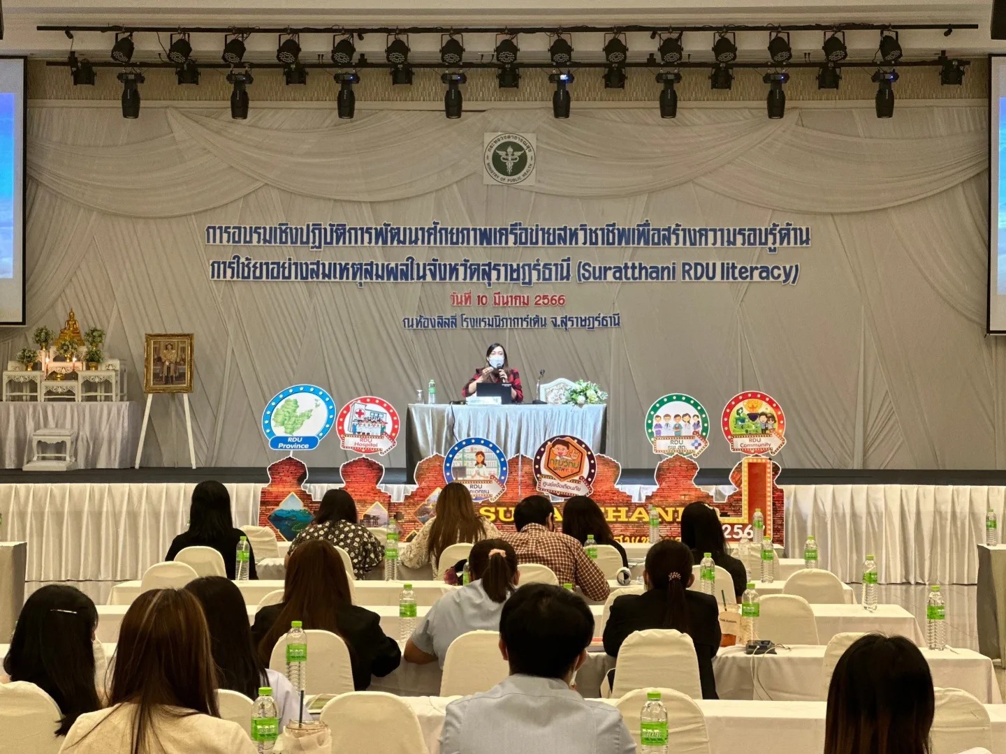On Friday, March 10, 2023, Dr. Tida Sottiyotin, School of Pharmacy, Walailak University gave a lecture in the training workshop on multidisciplinary network potential development to build knowledge on rational drug use in Surat Thani Province (Surattani RDU literacy) organized by Surat Thani Provincial Public Health Office at Nipa Garden Hotel, Muang District, Surat Thani Province with participants from community hospitals, District Public Health Office, Tambon Health Promoting Hospital, Private hospital and pharmacists who are responsible for operating drugstores in Surat Thani Province, about 200 people.