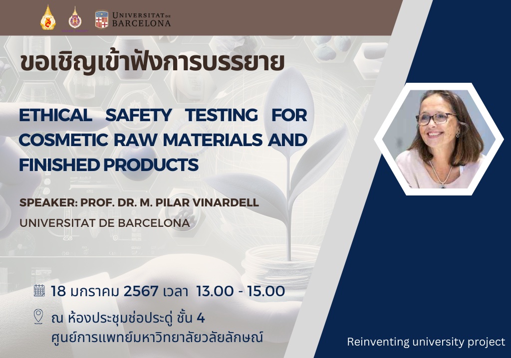 The School of Pharmacy, Walailak University, in collaboration with Mae Fah Luang University, is pleased to extend an invitation to you for our upcoming seminar on “Ethical Safety Testing for Cosmetic Raw Material and Finished Products.” We are honored to have Prof. Dr. M. Pilar Vinardell from Universitat de Barcelona as the distinguished speaker for this event. You can attend the seminar on January 18, 2024 from 1:00 p.m. to 3:00 p.m. at the Chopradu conference room. Hospital Walailak University