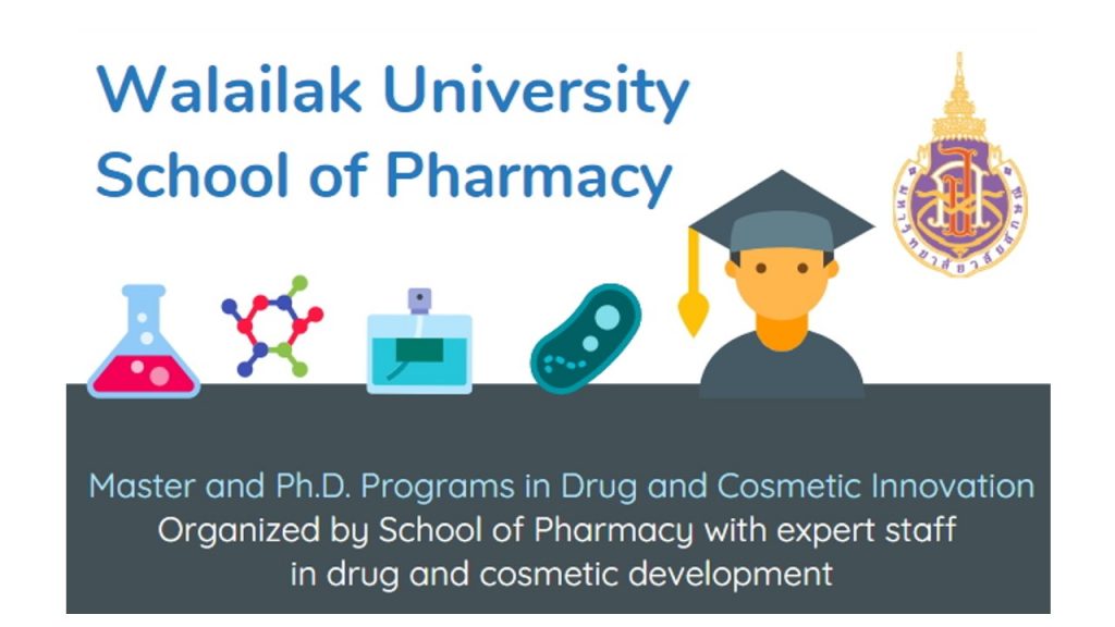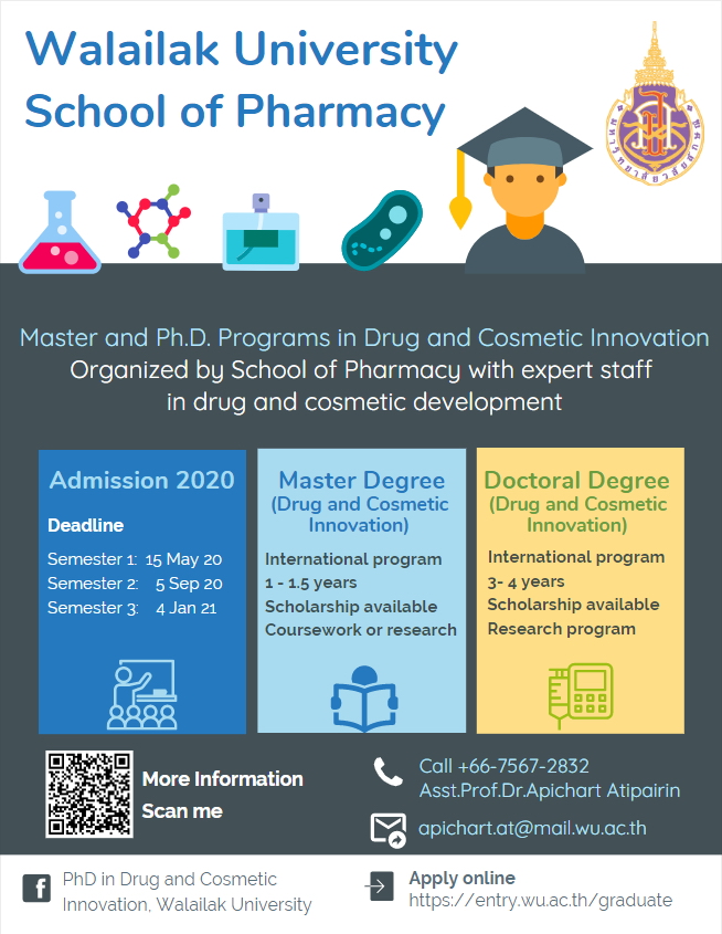 Are you interested in pursuing graduate studies in Drug and Cosmetic Innovation with a chance to win a full scholarship? Contact us ASAP. Here at the School of Pharmacy, Walailak University, we currently offer Master and Ph.D. programs in Drug and Cosmetic Innovation. Please contact Assistant Professor Dr. Apichart Atipairin, The Graduate Studies Coordinator of School of Pharmacy via telephone: +66-7567-2832 or email: apichart.at@mail.wu.ac.th.