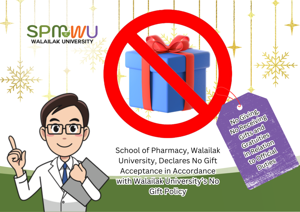 According to the announcement of Walailak University regarding the No Gift Policy for the fiscal year 2025, dated December 23, 2024, to ensure smooth, convenient, transparent, and accountable operations, the School of Pharmacy at Walailak University will not accept any gifts or gratuities in the performance of its duties following the university’s No Gift Policy.