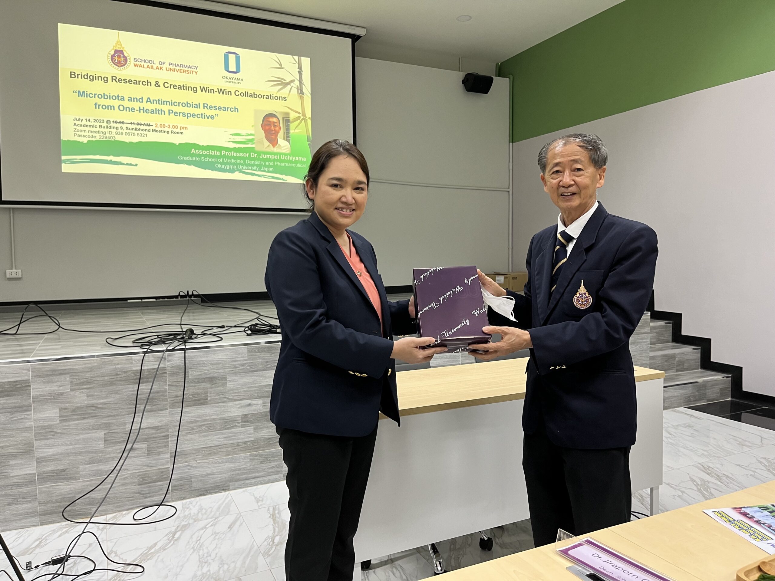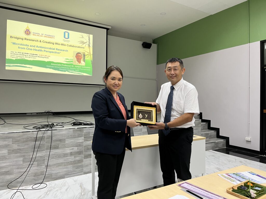 Friday 14th July 2023, Assistant Professor Dr. Aruna Prasoptham, Assistant Dean of the School of Pharmacy, Walailak University said Associate Professor Dr. Jumpei Uchiyama จาก Okayama University, Japan visited the School of Pharmacy, Walailak University, Nakhon Si Thammarat, Thailand. He had the program to meet the Dean of the School of Pharmacy and staff who were interested in antimicrobial research. The collaboration on Academic research was established. In this meeting, the special guest, Associate Professor Dr.Weerawath Mahathanatrakul was the initiator of this event also joined this meeting.