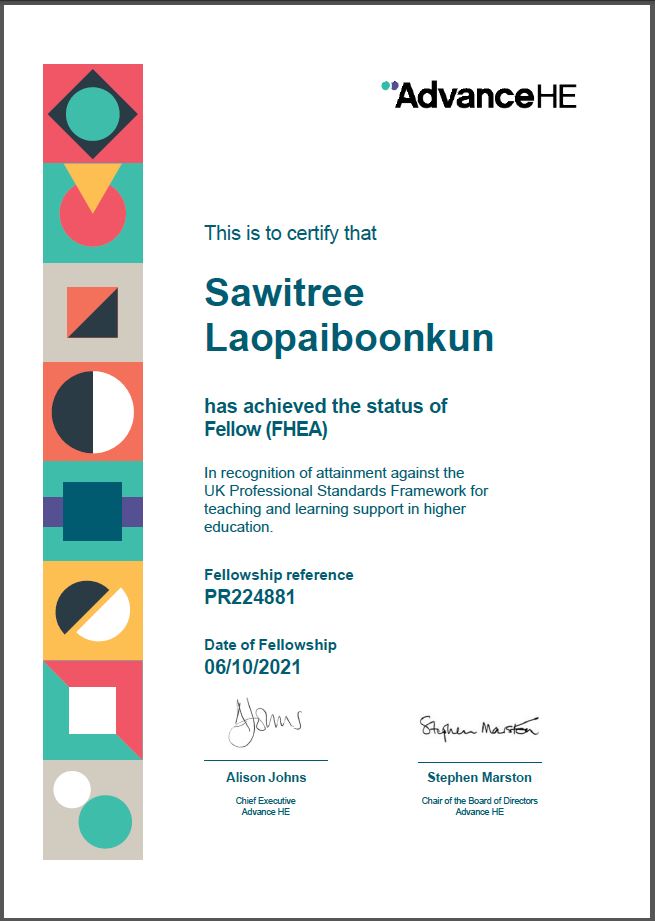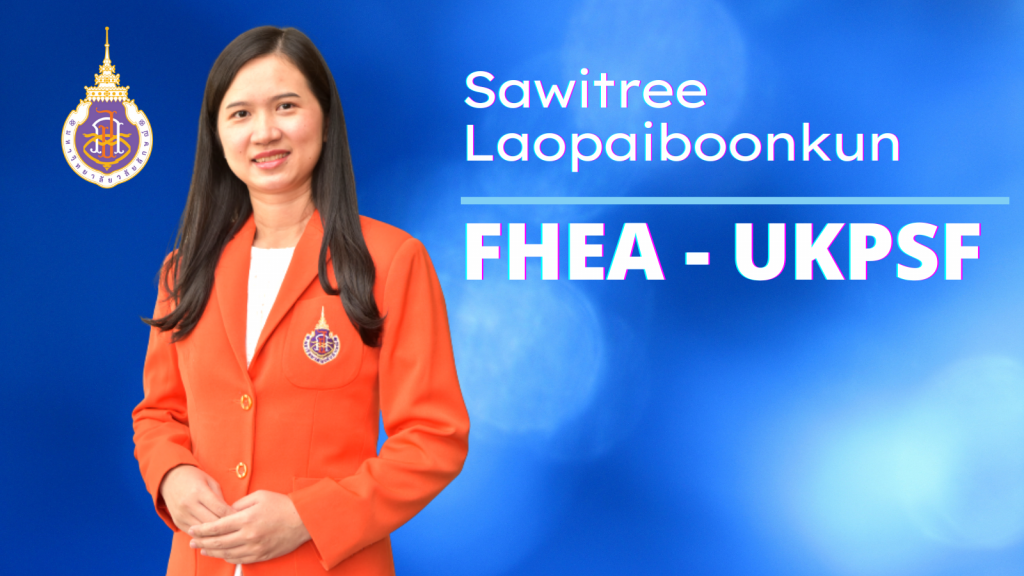 Walailak University is the head of Thai University for improving the education system in Thailand. All members of staff need to improve themselves for teaching. The innovation and technology of education were provided in the classroom of Walailak University with the high potential of staff. The UKPSF was introduced in the education system at Walailak University. Now more than 427 staff of WU were certified by HEA or the Higher Education Academy, UK. Today, the School of Pharmacy (SPM) have a newest FHEA or Fellow in UKPSF. She is Mrs. Sawitree Laopaiboonkun. She is belong to Pharmaceutical care Department, School of Pharmacy, Walailak University.