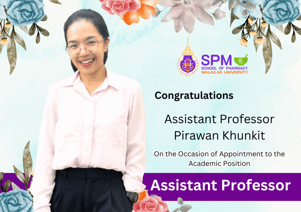 Walailak University issued the University Order No. 1703/2568 regarding the appointment of academic staff to academic positions, dated June 27, 2025. Among those appointed, Assistant Professor Pirawan Khunkij, a lecturer at the School of Pharmacy, Walailak University, has been officially appointed to the academic rank of “Assistant Professor” in the field of Clinical Pharmacy (Field Code 3303), effective from November 26, 2024. This appointment marks Assistant Professor Pirawan Khunkij as the newest Assistant Professor of the School of Pharmacy at Walailak University.