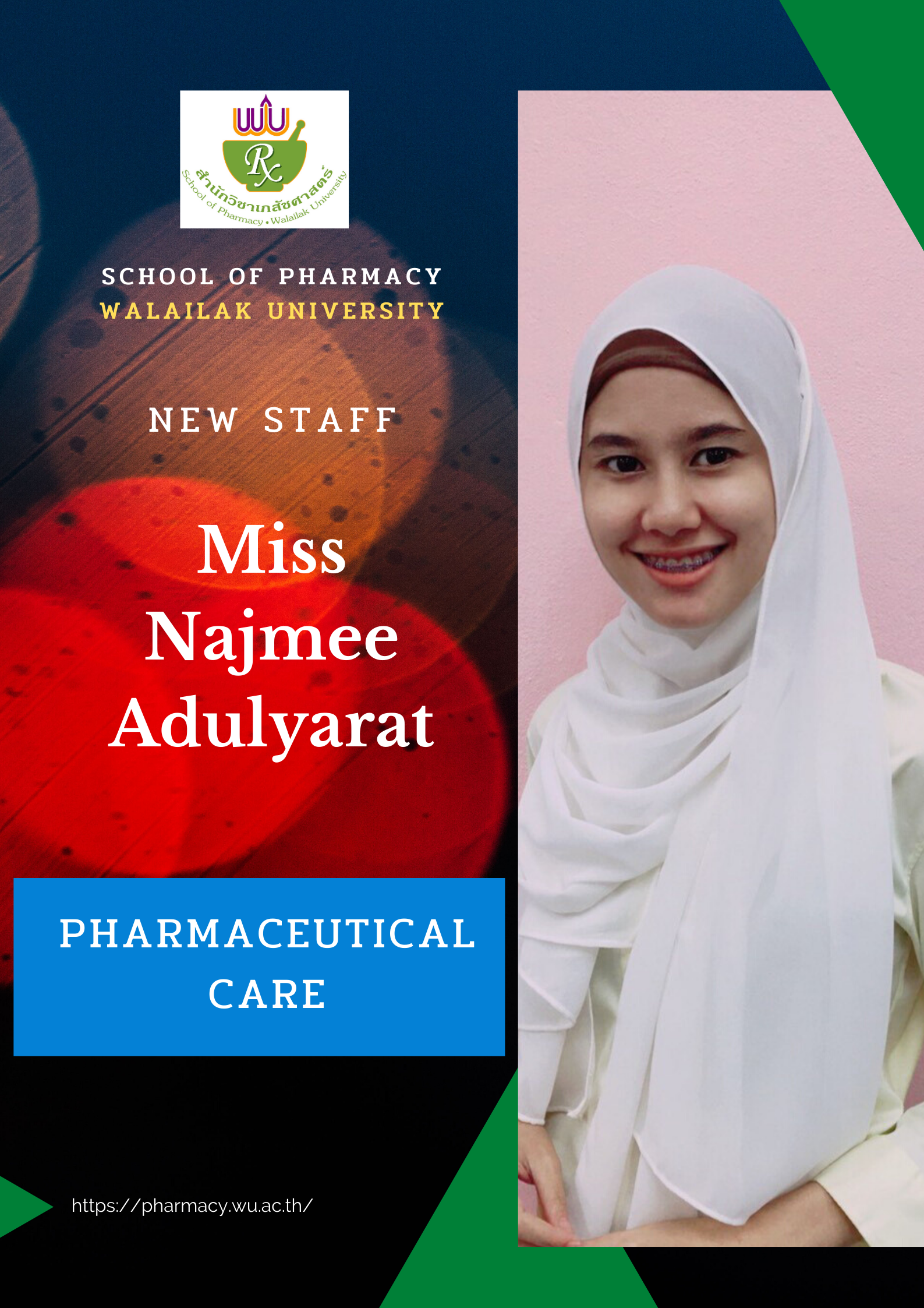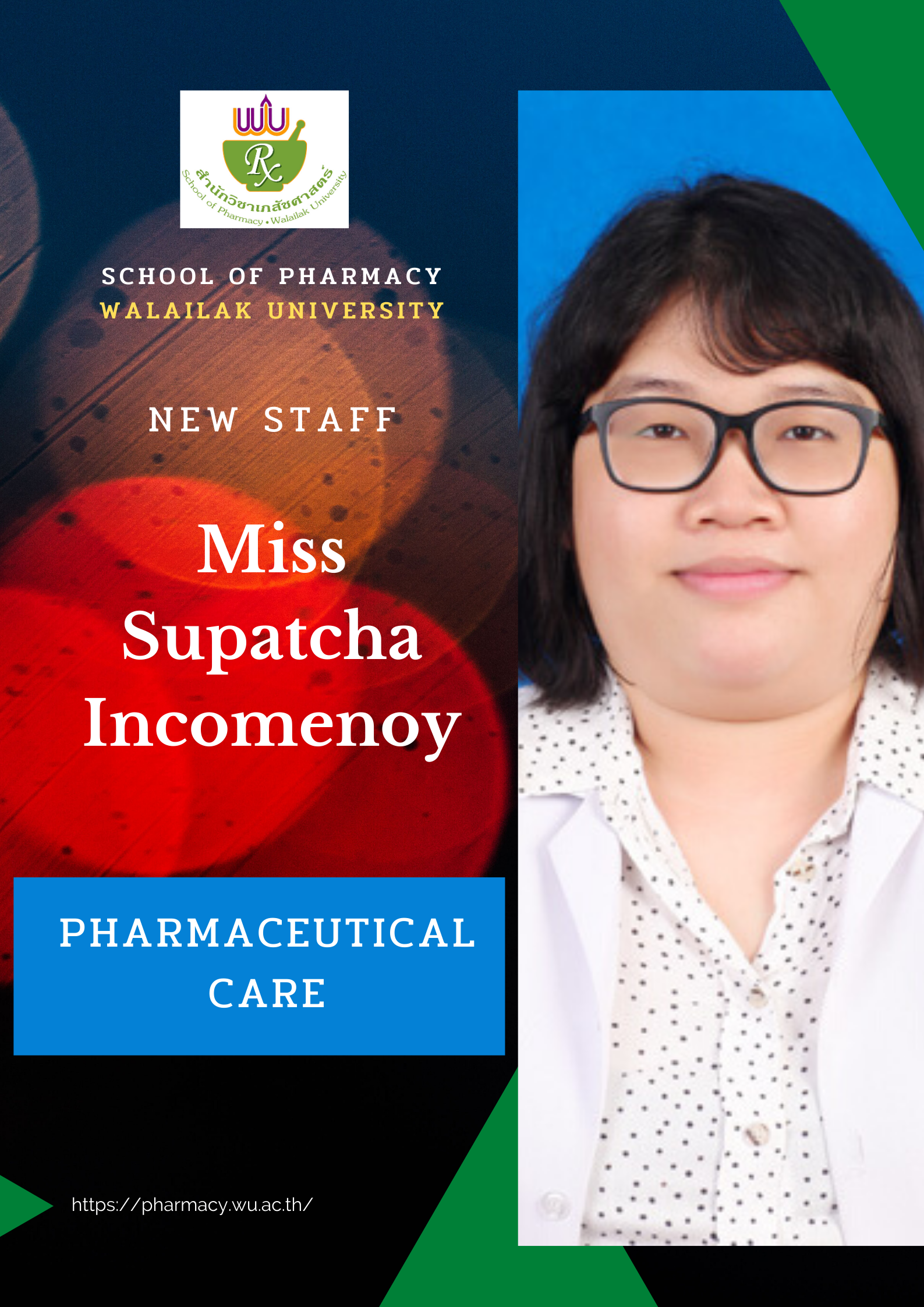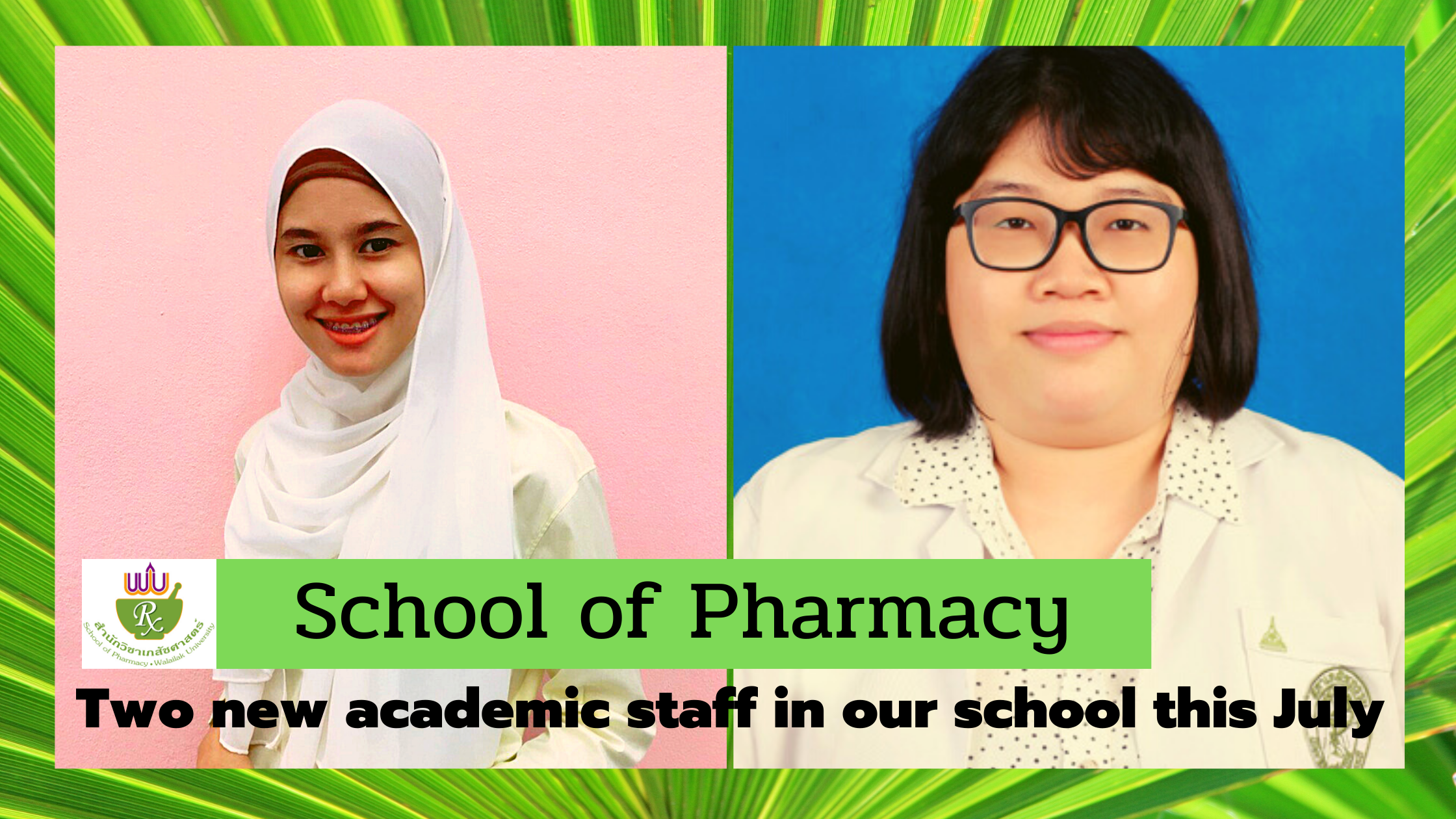 We are very grateful to officially welcome 2 new academic staff: Miss Najmee Adulyarat and Miss Supatcha Incomenoy to the pharmaceutical care division.