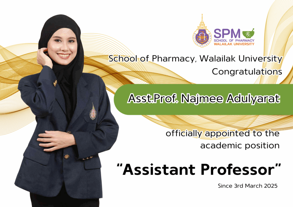 Under this order, Miss Najmee Adulyarat, B.Pharm. (Pharmacy), Khon Kaen University, has been officially appointed to the academic position of Assistant Professor in the field of Social and Administrative Pharmacy (Discipline Code 3304), effective from March 3, 2025.