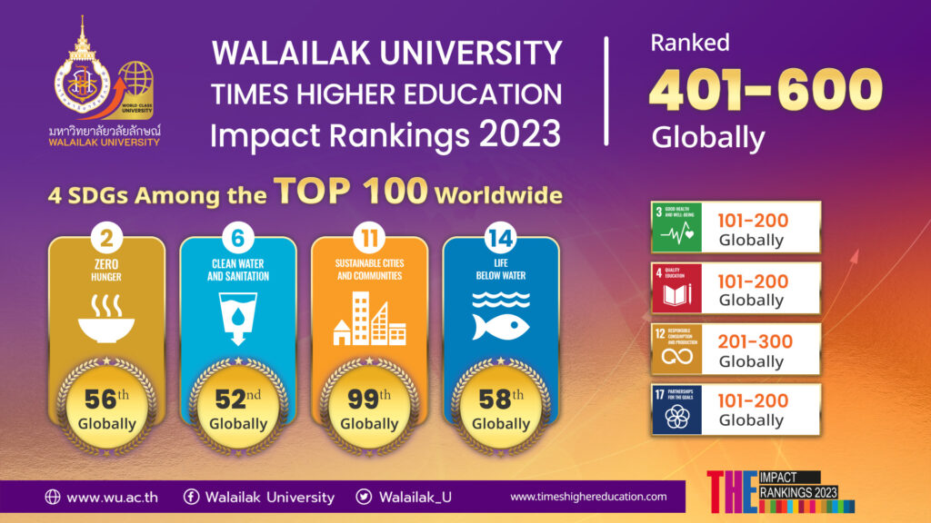 From: https://www.wu.ac.th/en/news/22832/walailak-university-rises-to-the-401-600-band-in-2023-times-higher-education-impact-rankings-ranks-top-100-worldwide-in-four-sdgs-zero-hunger-clean-water-and-sanitation-sustainable-cities-and-communities-and-life-below-water-nbsp-