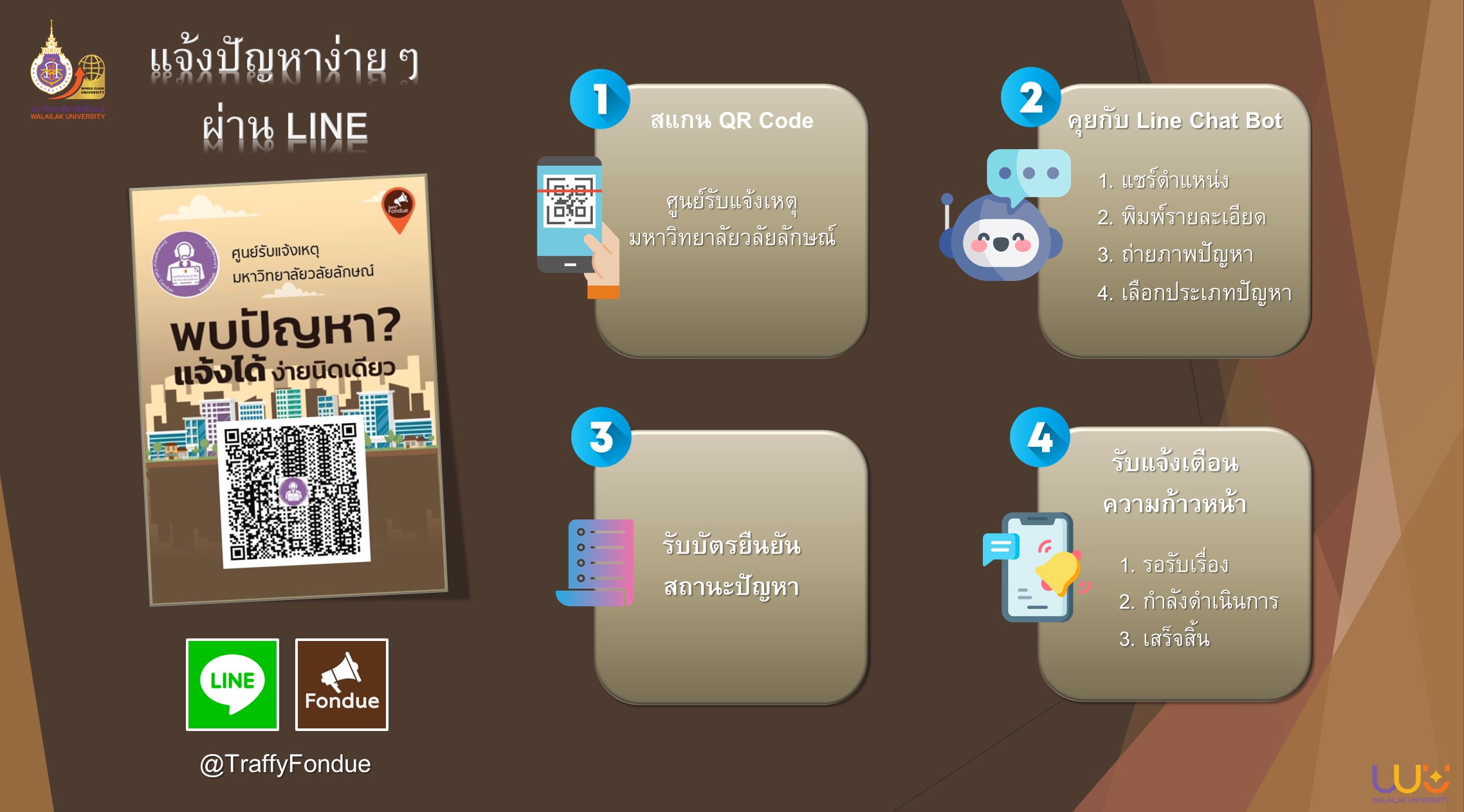 Platform “Traffy Fondue” by National Science and Technology Development Agency (NSTDA) The National Electronics and Computer Technology Center (NECTEC) is the platform for receive and response in emergency cases with Line Chatbot (Automatic) for all staff and students in Walailak University. Now this platform is ready to use in Walailak University, starting form 15 May 2023 (phase 1)