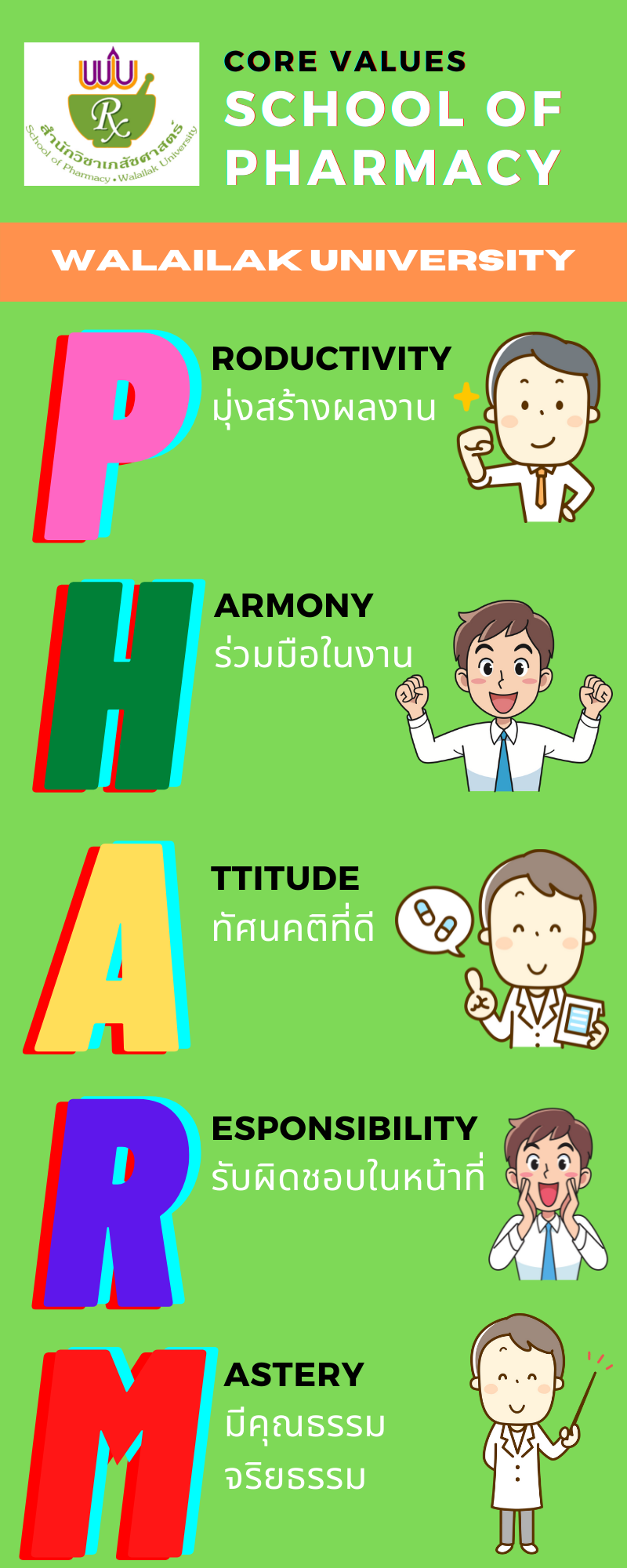 | P | Productivity | มุ่งมั่นในการทำงานและแสดงให้เห็นว่ามีการพัฒนาความรู้และทักษะต่างๆ อยู่เสมอจนทำให้ผลงานสำเร็จลุล่วงตามเวลา หรือการทำงานมีประสิทธิภาพสูง |